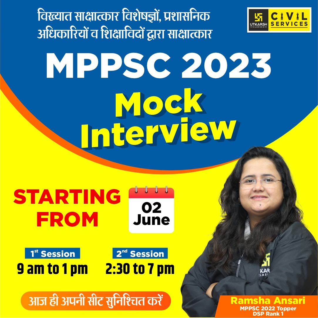 यदि आप अपनी सफलता सुनिश्चित करने के लिए साक्षात्कार की तैयारी को मजबूत करने के अवसर की तलाश में हैं तो उत्कर्ष वह स्थान है MPPSC MOCK INTERVIEW में शामिल होकर इसे प्राप्त कर सकते हैं।